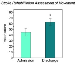 Data collected between 2015 and 2020; sample size = 52. Using the Stroke Rehabilitation Assessment of Movement, we measure basic mobility such as movement of your arms, lying down, sitting, standing, and walking. 100 = normal movement.